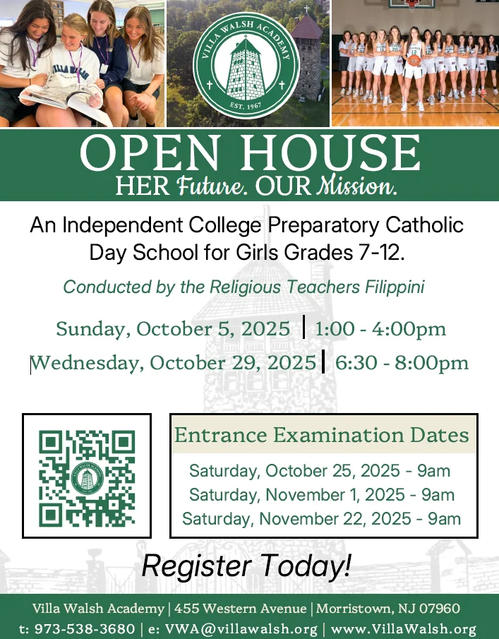 Founded in 1967, Villa Walsh Academy seeks academically-prepared young women whose curiosity allows them to embrace their individual talents, to enrich the school community, and in turn benefit from the unique and rigorous programs the school offers. Our academic community is comprised of highly qualified staff of religious and lay teachers who are committed to our mission of inspiring young women. We invite you to visit our bucolic campus, located on 120 acres of rolling hills in Morris County, and join us for upcoming admission events.