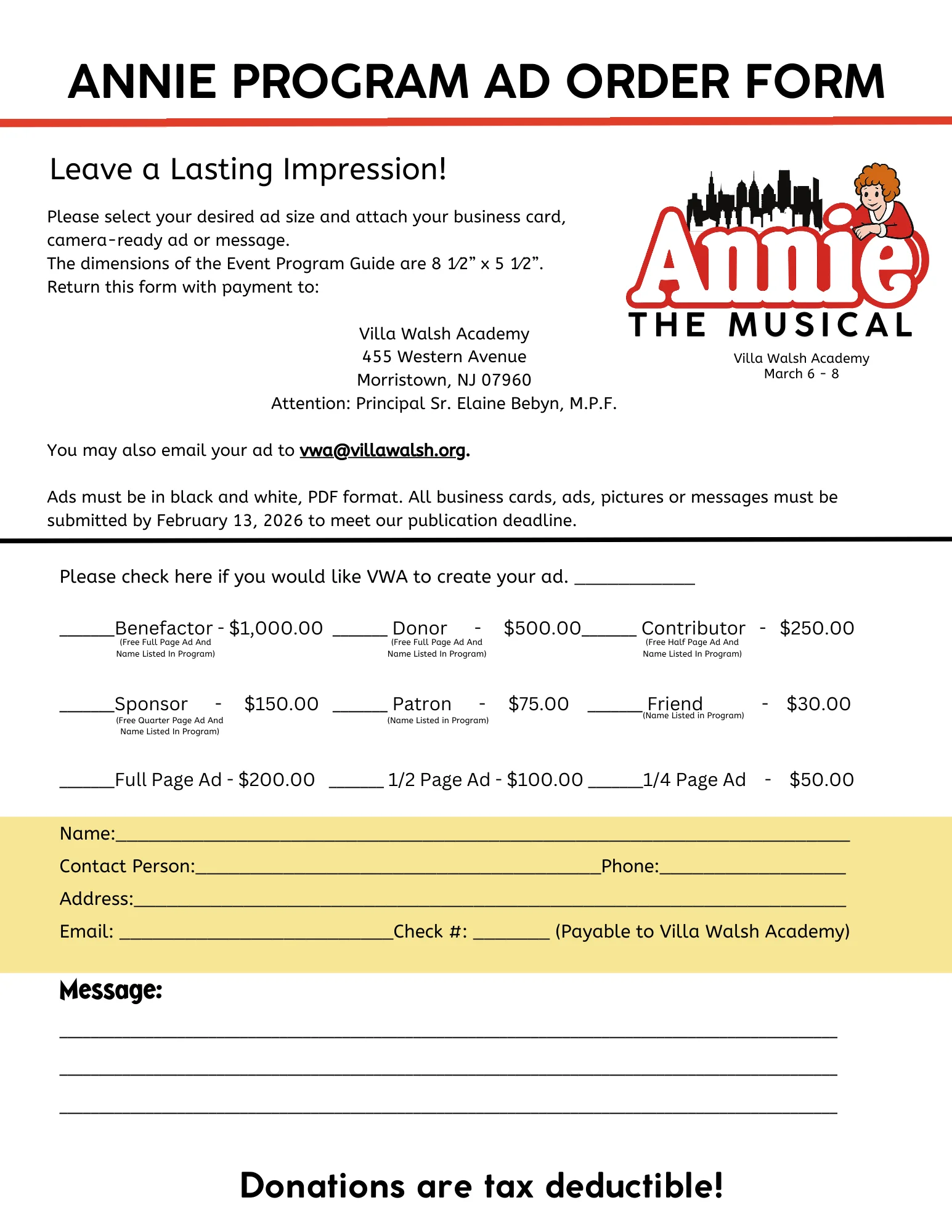 Sponsorship opportunities and ads in our program are both available for purchase. Sponsorships and ads help cover the cost of the production supporting the arts here at Villa Walsh Academy. Your support is much appreciated by all our actors, stage crew, and volunteers.