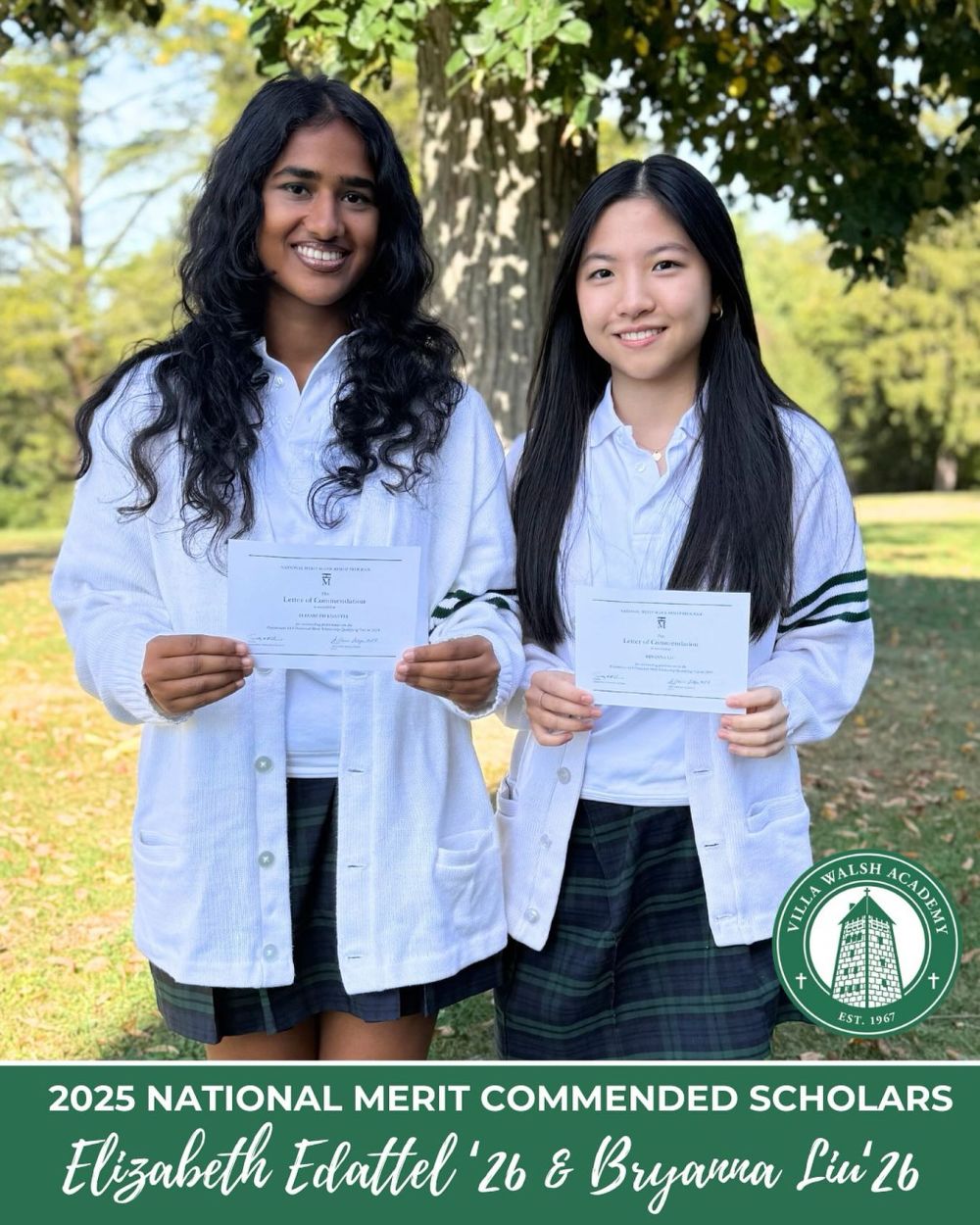 Villa Walsh Academy proudly recognizes our senior students Elizabeth Edattel ’26 and Bryanna Liu ’26 for being named National Merit Commended Scholars by the National Merit Scholarship Program!