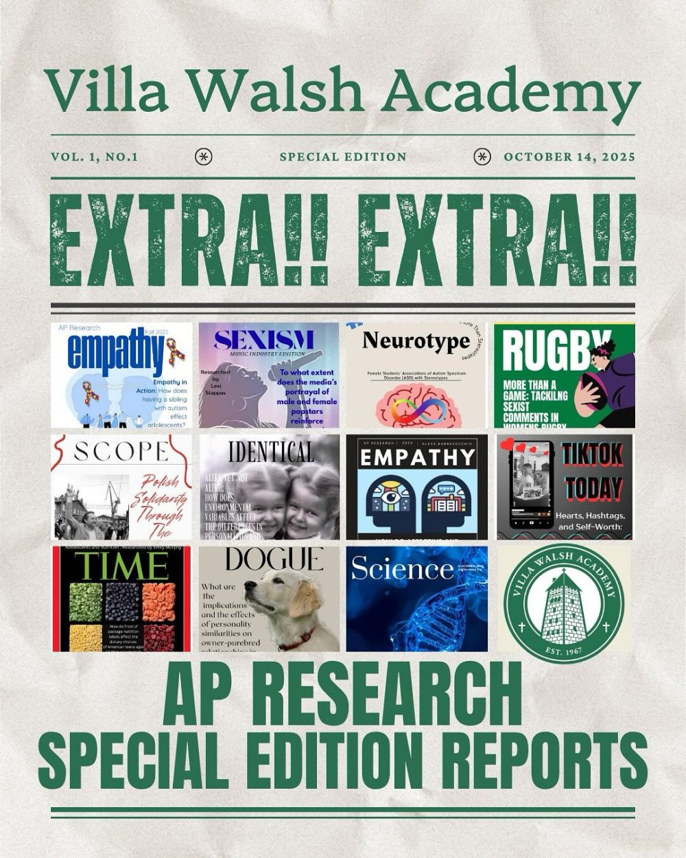 Villa Walsh Academy’s AP Research, paired with AP Seminar, empowers students to explore their individual passions, contribute original research, and make their voices heard through real-world data collection and analysis.
